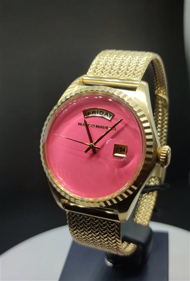 Orologio al quarzo, con bracciale maglia MIlano, con quadrante in smalto Rosa.
