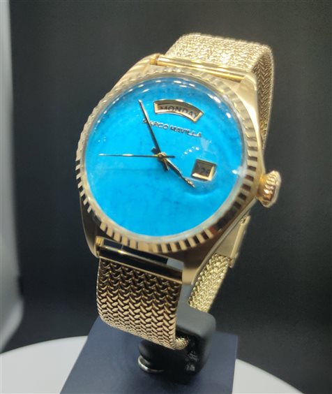 Orologio al quarzo con quadrante in pasta di Turchese, Bracciale maglia Milano.