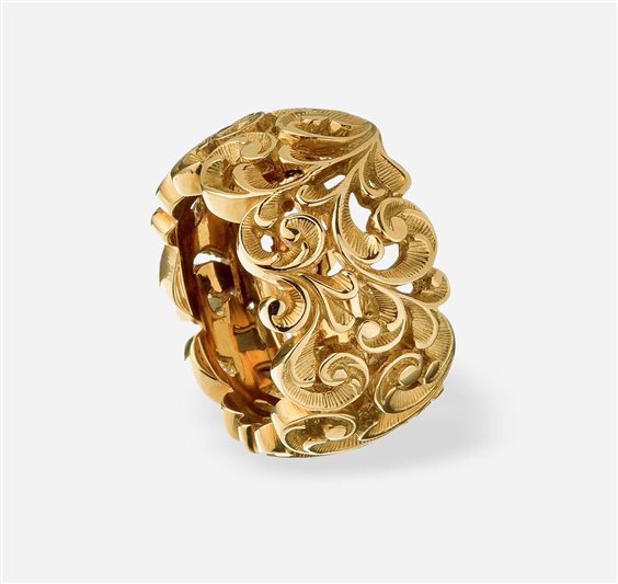 Anello a fascia larga disponibile in argento placcato oro 18 carati, leggermente bombato. In questo anello è possibile apprezzare al meglio l'intarsio tipico del brand e la lavorazione artigianale a bulino. Un pezzo unico. Larghezza fede: 1,5 cm Materiale: Argento 925 e oro 18 carati