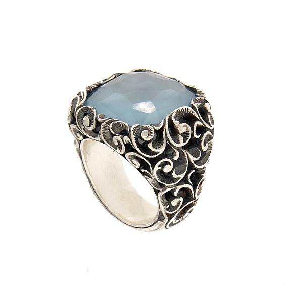 Anello in Argento cesellato a mano, con pietra naturale Calcedonio.