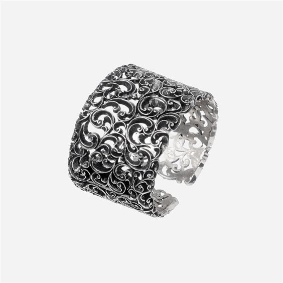 Il bracciale rigido a manetta larga in è uno dei bracciali più iconici della collezione in argento. Le sue linee damascate e l'intarsio fine creano un gioco di luce e contrasti che conferiscono preziosità e carattere. La chiusura perfettamente nascosta e integrata nella struttura inoltre lo rende pratico da indossare. Materiale: argento 925 brunito