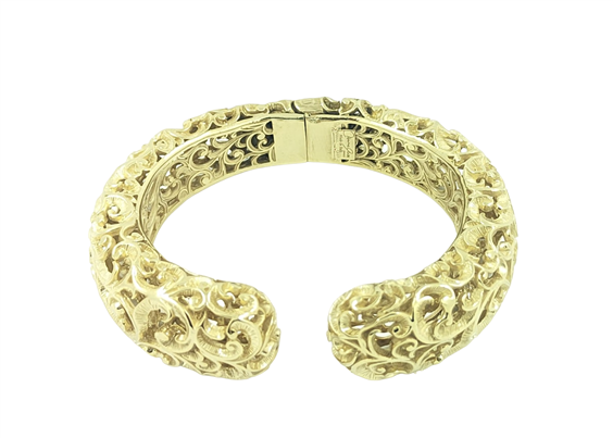 Bracciale contrariè L in argento placcato oro 18 kt e rifinito a mano. Facilmente indossabile grazie all'apertura centrale integrata nella struttura invisibile. Le sue linee damascate finemente intarsiate si incontrano e danno vita ad un bracciale prezioso. Diametro: 6x5 mm Materiale: argento 925 Dorato