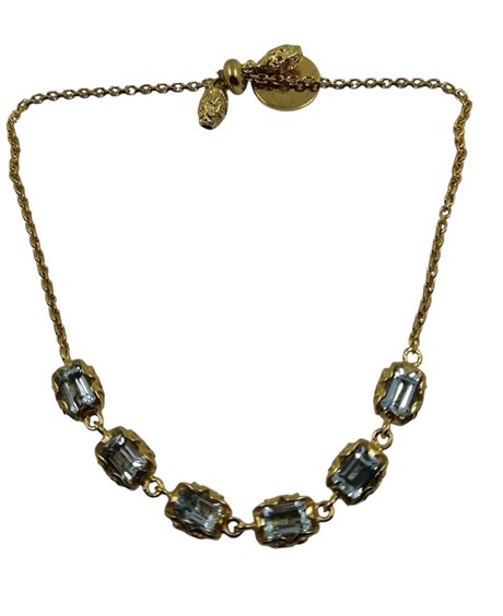 Bracciale sei pietre topazio azzurro, in argento placcato oro giallo 925°%, intarsiato con sei pietre taglio smeraldo con topazio azzurro incassato. Questo bracciale è composto da sei pietre taglio smeraldo con topazio azzurro incassato. Caratterizzato dall’intarsio, che è la cifra stilistica della Maison, che propone nelle sue collezioni come must-have per ogni donna
