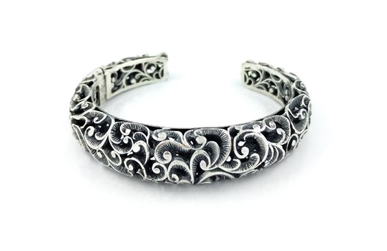 Il bracciale a manetta media bombata in argento è un dei nostri must have grazie alle sue linee damascate e all'intaglio tipico del brand. La chiusura è perfettamente integrata nella struttura e invisibile. Materiale: Argento 925 brunito Realizzazione: Italia Diametro: 6x5 centimetri Peso: 35,35 grammi Codice Prodotto: BA0148