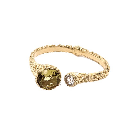 BRACCIALE RIGIDO IN ARGENTO 925 PLACCATO ORO GIALLO CON DUE PIETRE DI DIMENSIONI DIVERSE, LA PIETRA GRANDE QUARZO LEMON TAGLIO TONDO SFACCETTATA 15,70mm,LA PIETRA PICCOLA CRISTALLO DI ROCCA TAGLIO TONDO SFACCETTATO 8mm.