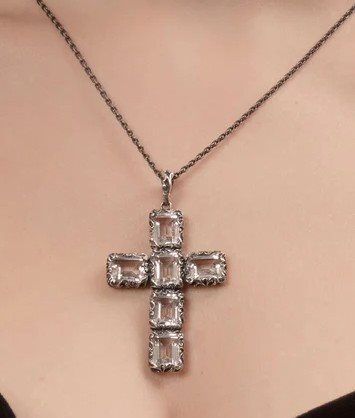 Collana in argento brunito 925% intagliato con croce con pietra rettangolare taglio sfaccettato con cristallo di rocca.