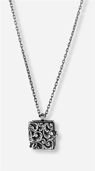 Collana in argento con ciondolo intagliato book loket apribile. Copertina disponibile in argento brunito. Aggiungendo l'incisione interna il tuo gioiello sarà un vero pezzo unico. Inserisci nelle note l'incisione richiesta. Ciondolo: 17,5x16,2 mm Lunghezza: 70/80 cm Materiale: argento 925 brunito Realizzazione: Italia Chiusura: T-bar