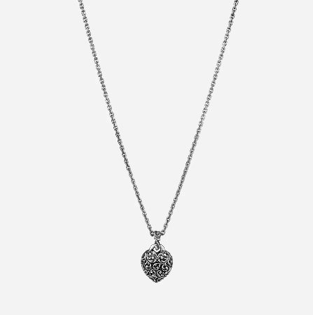Collana Shakti Love in argento brunito inciso a mano con l'antica tecnica del bulino. Cuore damascato in argento brunito con contromaglia intarsiata. Un cuore ricco di dettagli, attenzione e amore.