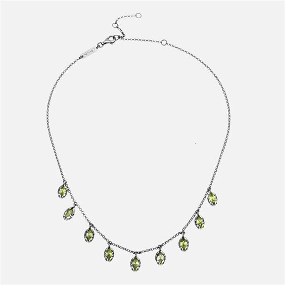 Collana girocollo della collezione Shri in argento brunito inciso a mano da maestri orafi Italiani con 9 pietre pendenti dal taglio navetta. Illumina il tuo look con il colore acceso delle pietre naturali.