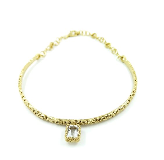 Collana Rigida Maria e Luisa Jewels, in Argento 925 Placcato in Oro Giallo, creata con l'antica tecnica del Bulino,con una pietra pendente rettangolare tagli smeraldo centrale in cristallo di rocca.