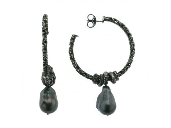 Orecchini a cerchio Maria e Luisa Jewels in Argento Brunito con Perla Barocca. Eleganti orecchini a cerchio medio in Argento Brunito incisi a mano impreziositi da una raffinata Perla Barocca grigia di fiume per dare ancora più forza al tuo stile. Tutta l'eleganza dei dettagli avvolge le superfici in argento cesellate a mano con la raffinata tecnica del bulino. Ogni gioiello Maria e Luisa Jewels è lavorato con passione e rigore da maestri orafi italiani.