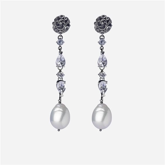 Orecchino con lenticchia grande a lobo in argento brunito inciso, pietre naturali e perla grande finale.