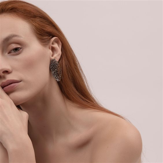 Orecchini a lobo con rosone ovale intagliato in argento placcato oro 18 kt. Un accessorio essenziale dal gusto vintage e dalla grande luminosità magnetica. Peso: 14,6 g Materiale: argento 925 e oro 18 kt Realizzazione: Italia