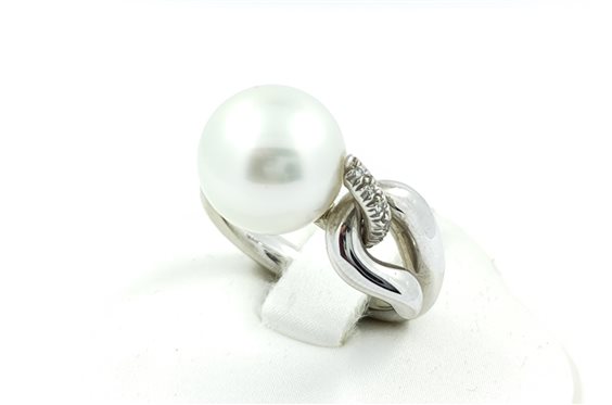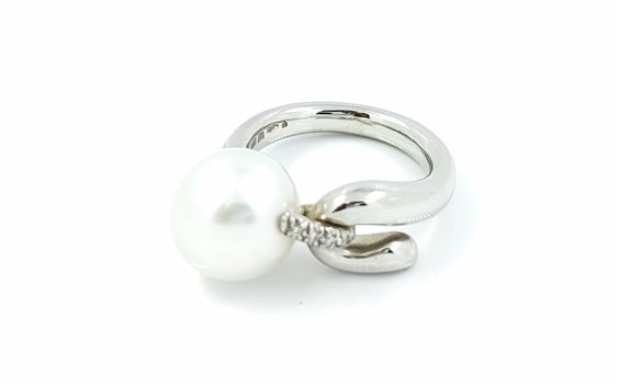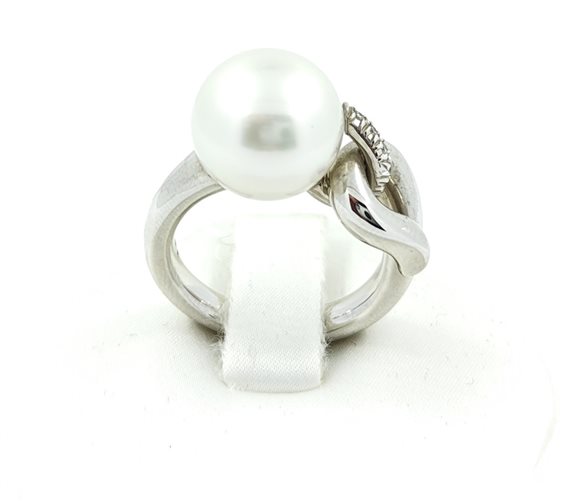 Anello Mikimoto, in Oro Bianco 18kt con Perla Coltivata e sul Gambo, Diamanti a Taglio Brillante.