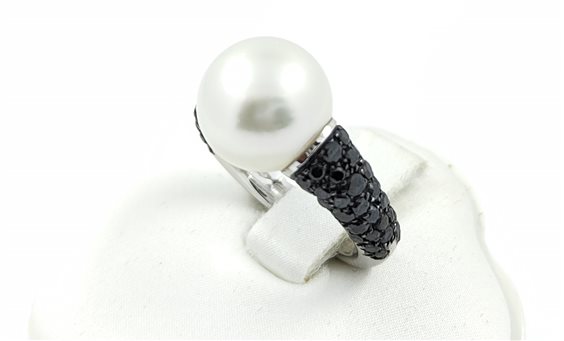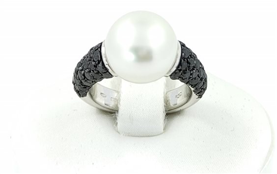 Anello Mikimoto in oro bianco Diamanti Neri ct. 1.43 con Perla coltivata Thaitiana mm 11.96
