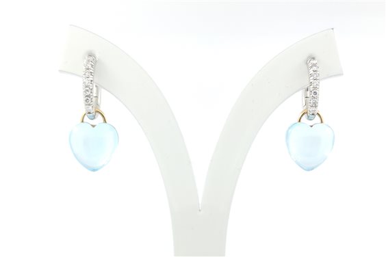 Coppia di Orecchini in Oro Bianco 18Kt con Diamanti a taglio Brillante e Pendente a cuore in quarzo azzurro.