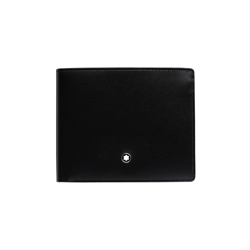 Portafoglio 6 scomparti, in pelle di vitello pieno fiore europea, nero lucido esclusivo Montblanc, fodera jacquard con marchio Montblanc, emblema Montblanc con anello finitura palladio, 6 tasche per carte di credito e fermasoldi.