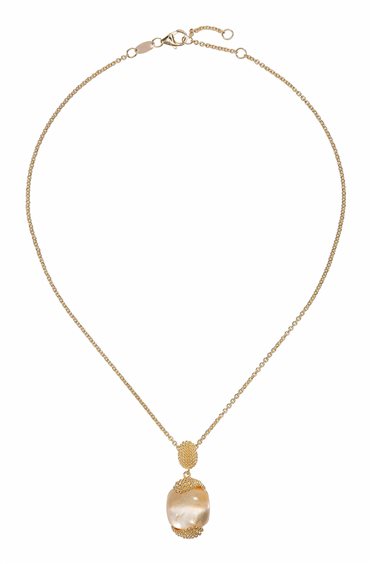 Catena maglia Rolò in Argento 925 placcato Oro Giallo con pendente tondo in Cristallo di Rocca e Madreperla.