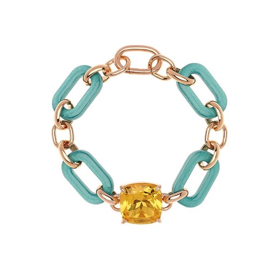 Bracciale realizzato in Italia, in legno d'ulivo laccato e smaltato a mano, metallo antiallergico placcato in Argento 925, impreziosito con quarzi idrotermali. Misure Bracciale: 18 cm. Il bracciale si può ottenere nelle colorazioni: Arancione ed Azzurro.