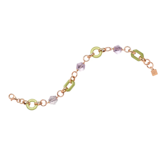 Bracciale realizzato a mano in Italia in Italia in argento 925 placcato oro rosa 24 kt, legno d’ulivo di recupero e pietre semi preziose: Ametista Rosa.