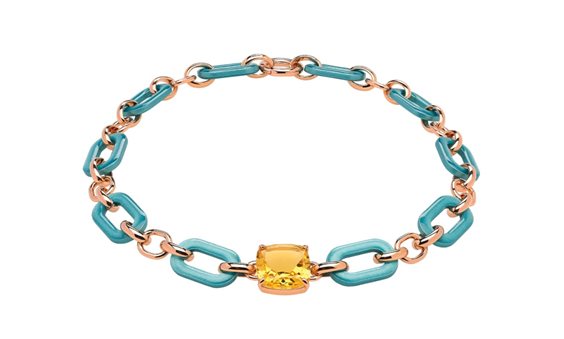 Girocollo realizzato in Italia, in legno d'ulivo laccato e smaltato a mano, metallo antiallergico placcato oro 24 carati, impreziosito con quarzi idrotermali. Girocollo disponibile in due misure: 38,5 cm o 41,5 cm.