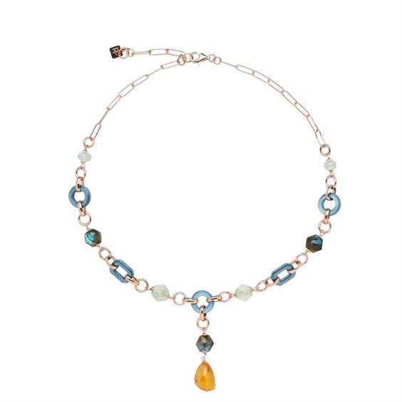 Girocollo realizzato a mano in Italia in Italia in argento 925 placcato oro rosa 24 kt, legno d’ulivo di recupero e pietre semi preziose: labradorite nera, ametista verde e goccia di citrino giallo.