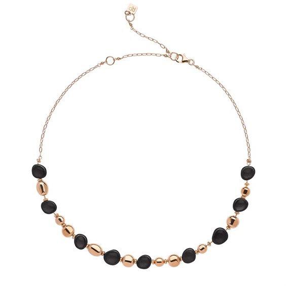 Girocollo realizzato in Italia, in legno d'ulivo laccato e smaltato a mano impreziosito da pepite in argento 925 placcato oro rosa 24 carati.