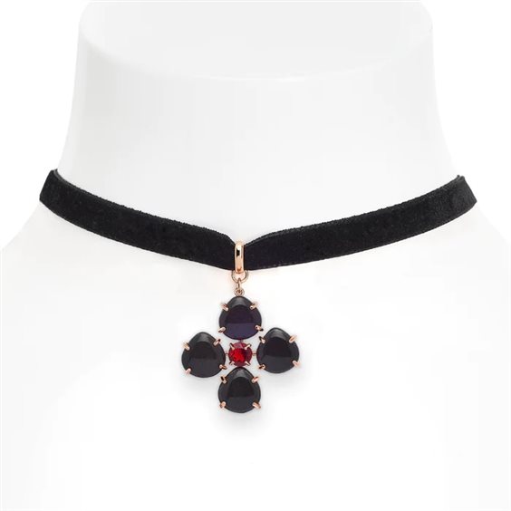 Girocollo realizzato con struttura architettonica, in argento 925 placcato oro rosa, a forma di croce stilizzata arricchito da legno d’ulivo di recupero laccato e smaltato, quarzo idrotermale e pietre naturali e cordino in velluto nero, Lunghezza 90 cm. Composizione di pietre: Disponibile nelle colorazioni Red Istinct oppure Black Velvet oppure Glow.