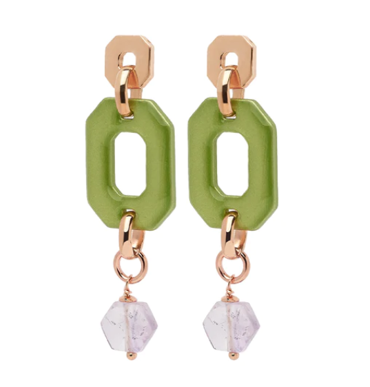 Orecchini realizzati a mano in Italia in argento 925 placcato oro rosa 24 kt, legno d’ulivo di recupero e pietre semi preziose: Ametista rosa