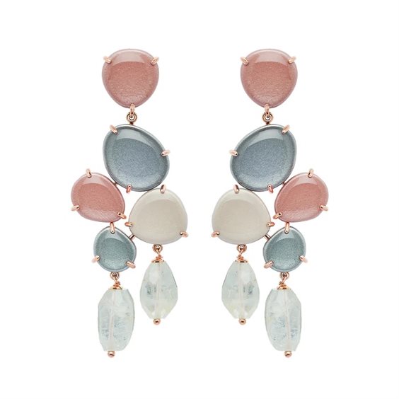 Orecchini realizzati con struttura architettonica, in argento 925 placcato oro rosa, dal disegno irregolare e arricchiti da legno d’ulivo di recupero laccato e smaltato e da pietre naturali. Composizione di pietre: Acquamarina Labradorite Bianca, Ametista Verde Quarzo Fumè.