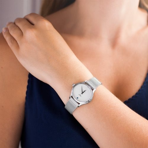 Il Tissot Bella Ora dona eleganza a ogni donna che lo indossa. I dettagli, come il bracciale gioiello o la rifinitura sulla corona che riprende il colore del quadrante, creano una linea alla moda, con un gusto retrò.