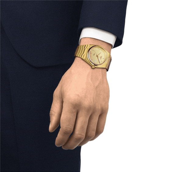 Nel 1978 Tissot creò un modello al quarzo, caratterizzato da una cassa sottile, indici stretti e un bracciale in acciaio. La sua ampia ansa orizzontale, tipica dell'epoca, era perfettamente integrata nella cassa piatta a forma di tonneau. Pochi anni dopo, Tissot ha registrato il nome PRX. "PR" sta per "preciso" e "robusto". La "X" sta per il numero romano dieci e per la pressione di 10 bar che l'orologio è in grado di sopportare. Nel 2021 Tissot ha presentato il PRX 40205, È una versione moderna del modello precedente. La cassa in acciaio inossidabile 316L del Tissot PRX 40205 ha un diametro di 40 mm. Ha una forma leggermente tonneau ed è ornato da una lunetta stretta e rotonda. Ai lati, spazzolate verticalmente, finiture arrotondate si alternano a sfaccettature lucide. Il Tissot PRX 40205 Quartz è dotato di un quadrante con un motivo a raggiera nero o blu in combinazione con indici e lancette nichelati. Esiste anche una variante con quadrante grigio argento satinato con indici e lancette color oro rosa, una combinazione di colori che ricorda la fine degli anni '70. La flessibilità e morbidezza delle maglie ne fanno un vero successo di design ergonomico e trasmettono uno straordinario comfort. Le lancette del PRX 40 205 sono dotate di un rivestimento SuperLumiNova® e sono posizionate l'una sull'altra con uno spazio minimo. Ciò consente di avvicinare il quadrante al vetro dell'orologio. L'effetto ottico ottenuto dai designer Tissot fa sembrare la cassa dell'orologio ancora più piatta e sottile di quanto non sia in realtà.