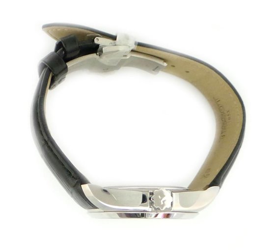 Orologio solo tempo con giorno e data, cassa in acciaio e cinturino in pelle nera con chiusura deployante, quadrante nero, movimento svizzero automatico a vista, vetro zaffiro, diametro cassa 39 mm. W.R. 10 ATM. Completamente Swiss Made
