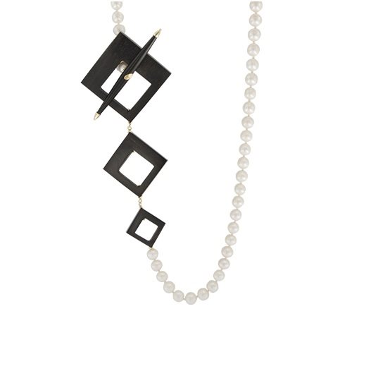 Collana Fornieri Cocò in Legno di Ebano, Argento 925 e perle coltivate acqua dolce. La collana è modulabile, consente di sfruttare in cinque diversi modi per poterla indossare.